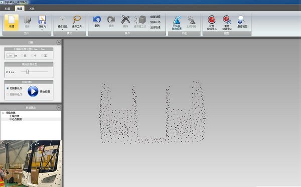 以全局攝影測量系統(tǒng)獲得的標記點數(shù)據(jù)為整體基準,輻射到個別掃描區(qū)域,掃描汽車整車以及部分拆解后的零件,獲取其三維數(shù)據(jù)。